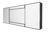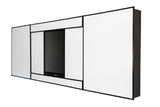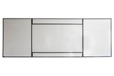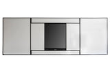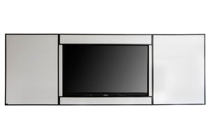 Fixed vitreous enamel writing surfaces on the left and right, as well as narrow top and bottom panels. Sliding vitreous enamel surfaces in the center to cover and secure the interactive LED panel or TV screen.